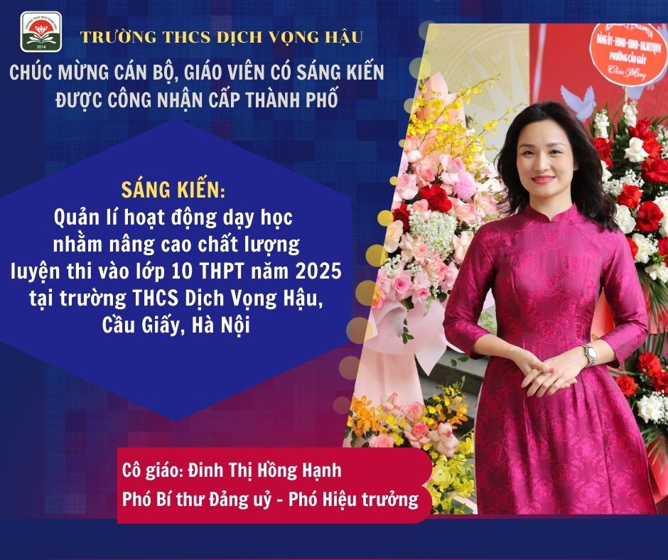 Trong hành trình đổi mới và nâng cao chất lượng giáo dục, trường THCS Dịch Vọng Hậu luôn coi trọng việc nghiên cứu, ứng dụng và lan tỏa các sáng kiến như một yếu tố góp phần phát triển chuyên môn. Những sáng kiến được công nhận hiệu quả áp dụng và khả năng nhân rộng cấp Thành phố không chỉ khẳng định giá trị thực tiễn, phạm vi ảnh hưởng rộng rãi, mà còn góp phần thiết thực vào việc xây dựng môi trường dạy học sáng tạo, hiệu quả và phù hợp với yêu cầu đổi mới giáo dục hiện nay.